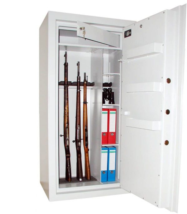 Sicherheitsmerkmale und Konstruktion • Vierwandige Türkonstruktion mit einer Gesamttürstärke von 125 mm • Korpus dreiwandig mit integrierten Stegprofilarmierungen Allseitige Feuerschutzisolierung nach DIN 4102 • Umlaufender Feuerfalz verhindert das direkte Eindringen von Feuer- und Brandgasen • Schrank vorgerüstet für Bodenverankerung. Lieferung inkl. Verankerungsmaterial • Türanschlag DIN rechts • Türöffnungswinkel 180° durch außenliegende Scharniere • Durch die vorstehenden Beschlagteile erhöht sich die Außentiefe um 50 mm